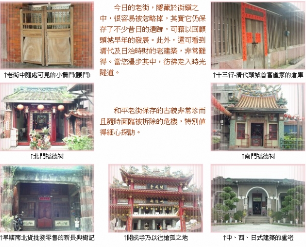 和平街是頭城最早發展的街道,古稱「頭圍街」。清代頭城的精華 區域,就是這裡,它見證了頭城以往的繁華歲月。同時,它也曾是宜蘭地區最重要的經濟中心,現在則是全宜蘭碩果僅存的老街,特別值得珍惜。